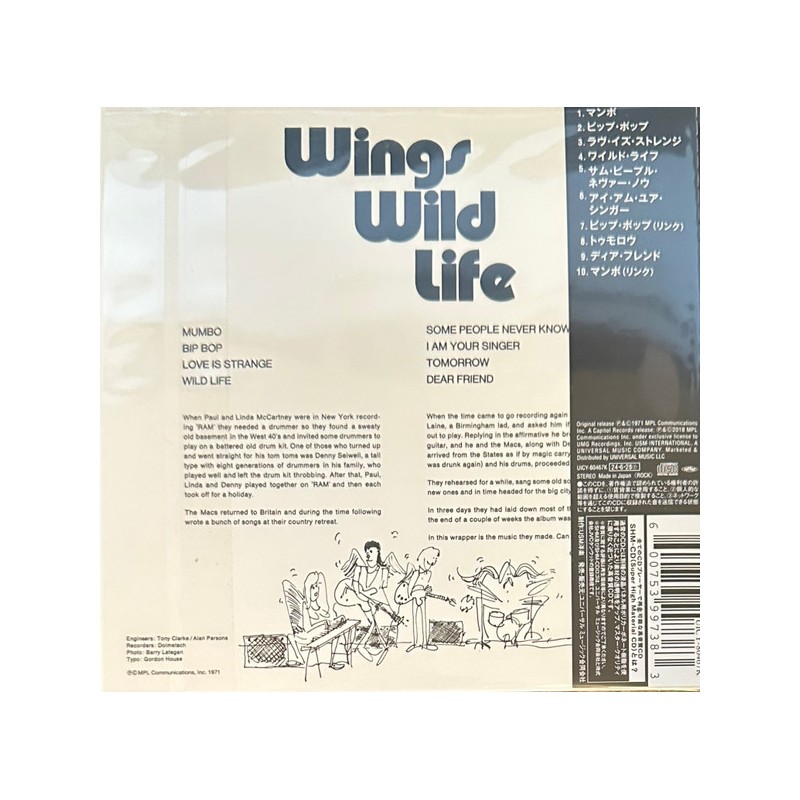 Japanse SHM-CD van het Paul McCartney / Wings album Wild Life. Komt in een kartonnen vinyl-replica hoes met obi-strip, 18-pagina booklet en een extra booklet met de lyrics in het Japans.