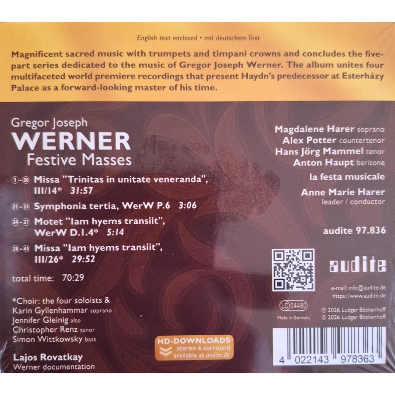The vocal parts of the works are performed by a double quartet, led by internationally acclaimed soloists. Under the musical direction of Anne Marie Harer, the recording cheerfully demonstrates that Werner's music - long silenced and overshadowed by Haydn - rightly deserves to be brought back to light and firmly established in the sacred music concert repertoire.