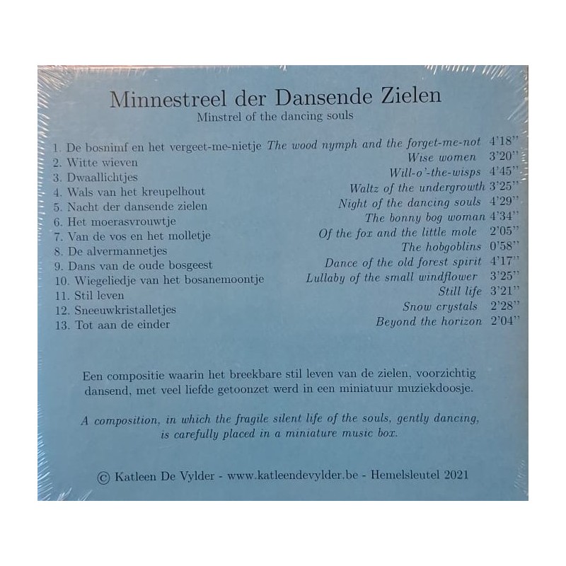 "Minnestreel der Dansende Zielen" is een muzikale composie van Katleen De Vylder, die een verhaal vol verhalen vertelt via de harp. De muziek bevat verschillende titels zoals De Bosnimf en het Vergeet-me-nietje, Witte Wieven, en Nacht der Dansende Zielen